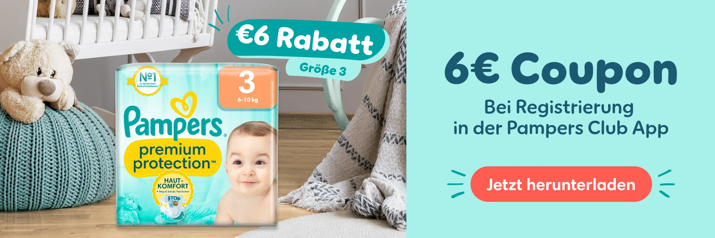 Limitiertes Angebot: Gültig nur für neu registrierte Nutzer der Pampers Club App (seit 01. Juli 2024) und für bestimmte Windelgrößen und Produkte (Übersicht in der App).